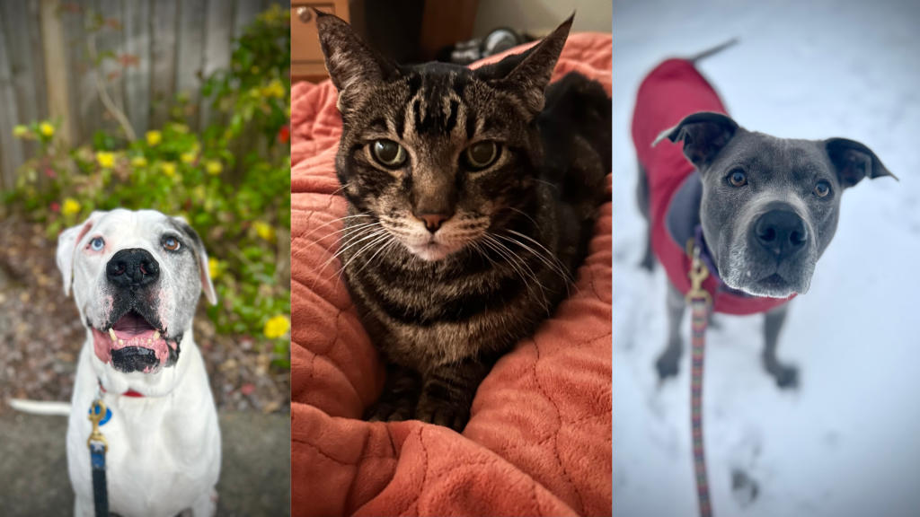 At home, Emily shares her life with three senior companions: Junior, an American Bulldog; Rosie, a blue nose pittie; and Kaya, a cat who prefers her independence.